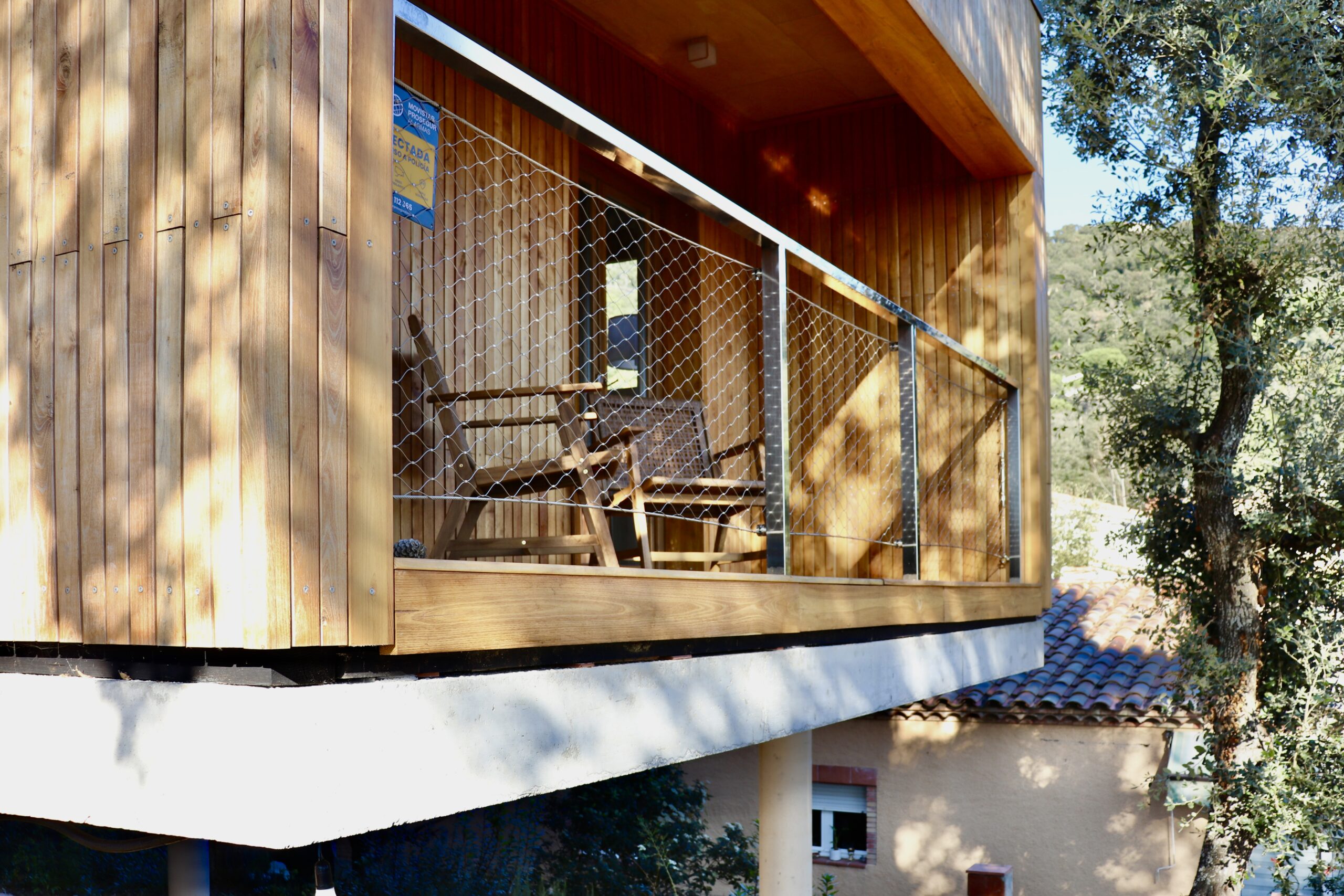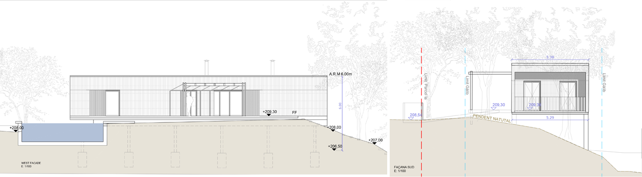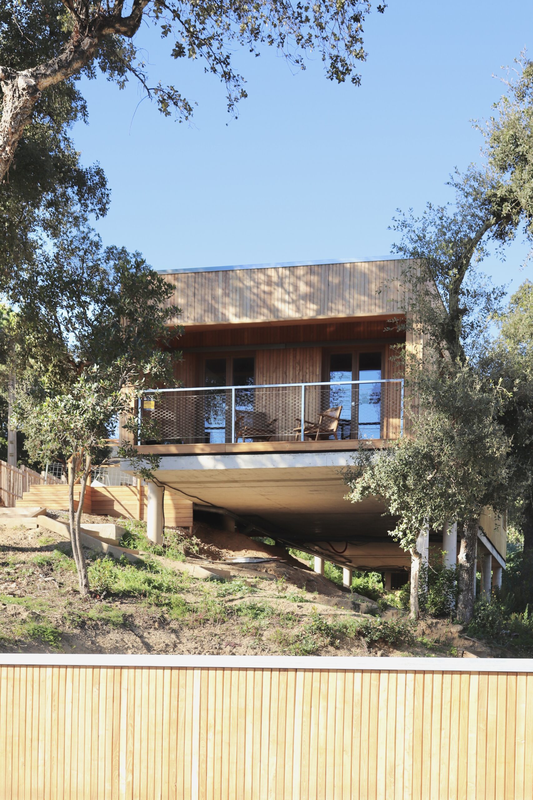 Sistema d’entramat lleuger de fusta, amb un revestiment exterior de lames verticals d’acàcia. El forjat és una llosa de formigó armat sobre pilar de formigó.