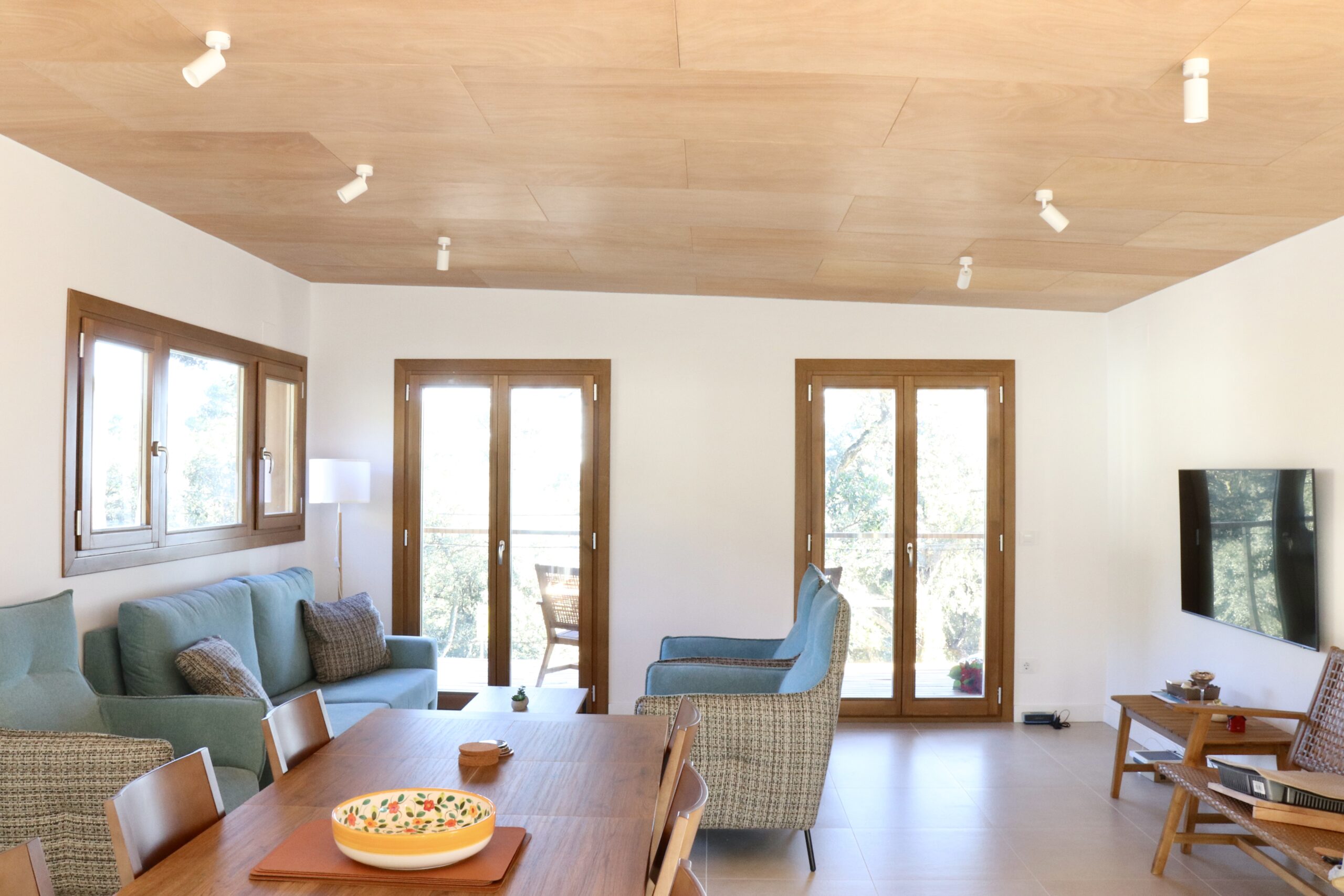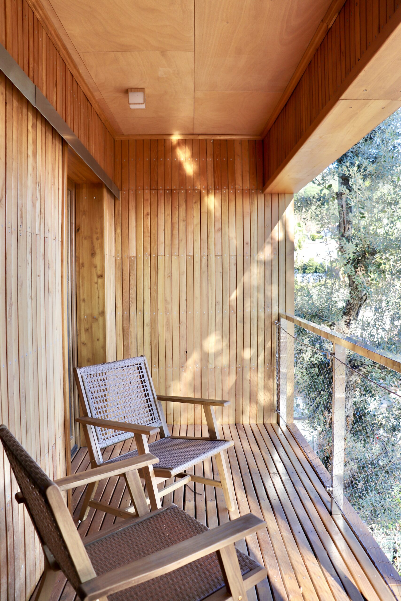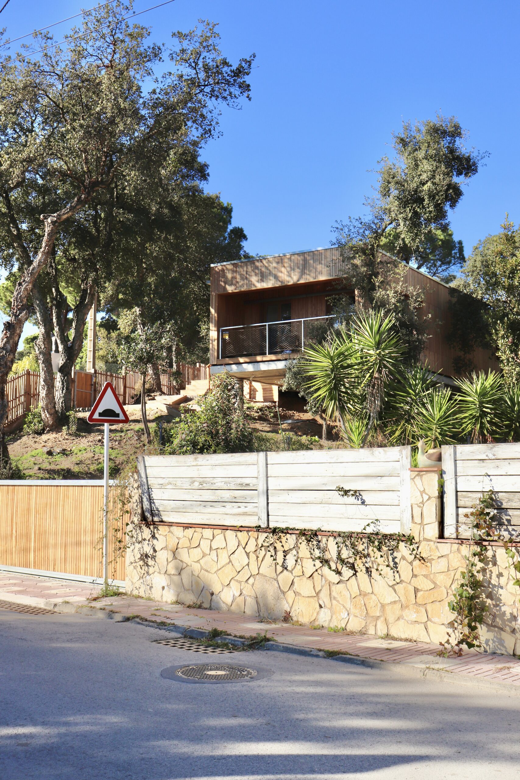Sistema d’entramat lleuger de fusta, amb un revestiment exterior de lames verticals d’acàcia. El forjat és una llosa de formigó armat sobre pilar de formigó.