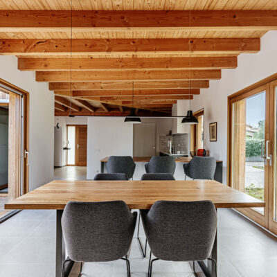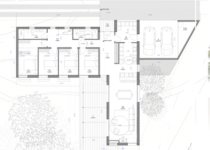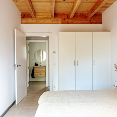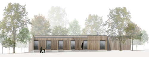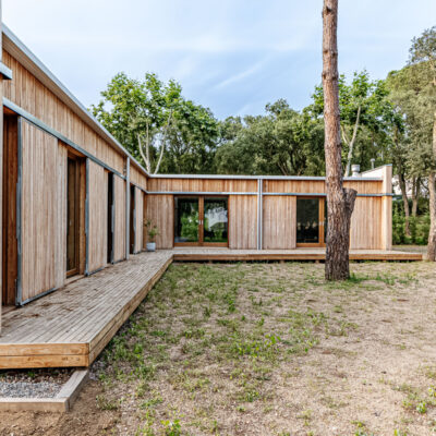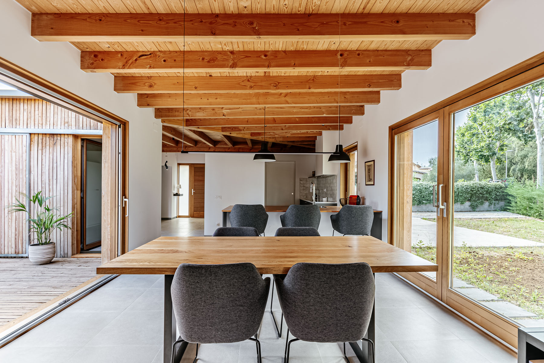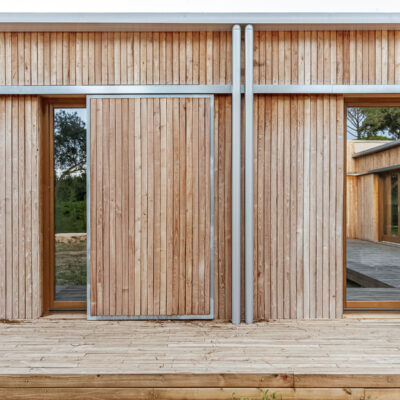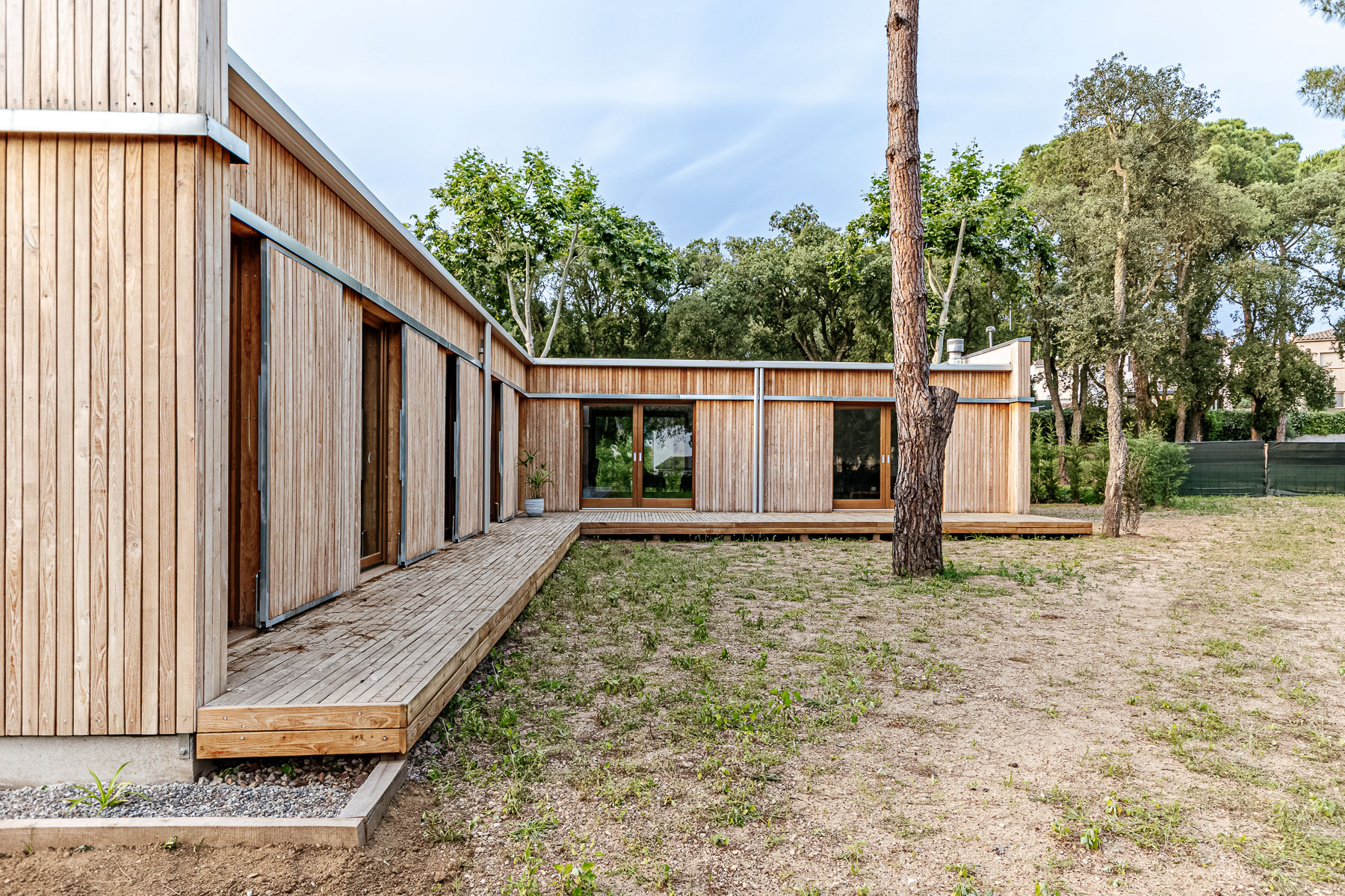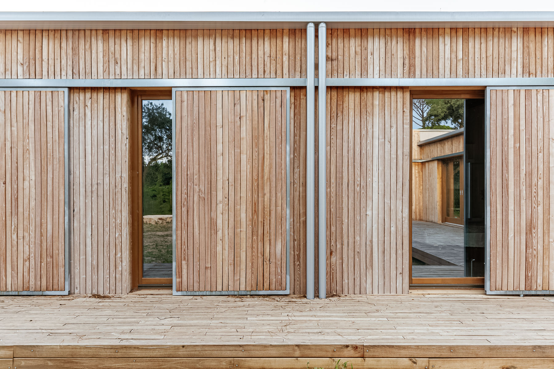 Sistema d’entramat lleuger de fusta, amb un revestiment exterior de lames verticals d’acàcia. El forjat és de bigues de formigó pretensades amb revoltons, i la coberta és plana amb membrana polimérica i estructura de bigues de fusta.